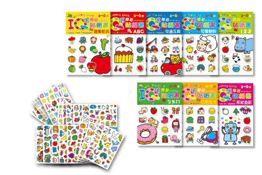 「IQ數學貼紙書」全套共分8個類別,藉由組合黏貼的遊戲方式讓孩子產生興趣,在無形之中達成學習效果。組合過程中能訓練孩子的手眼協調能力,也能訓練孩子感官系統與肌肉的發展,提升智慧及訓練手指的靈巧度。並讓孩子學習數學方面各類別的思考與對應關係,增強記憶力及提升對各類別的知識學習。