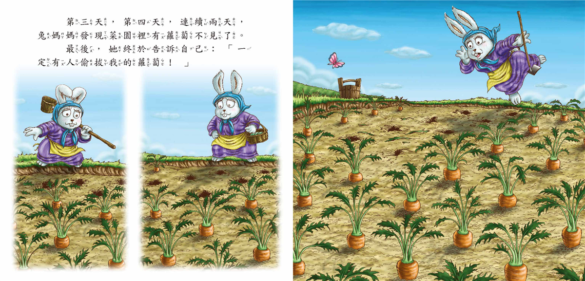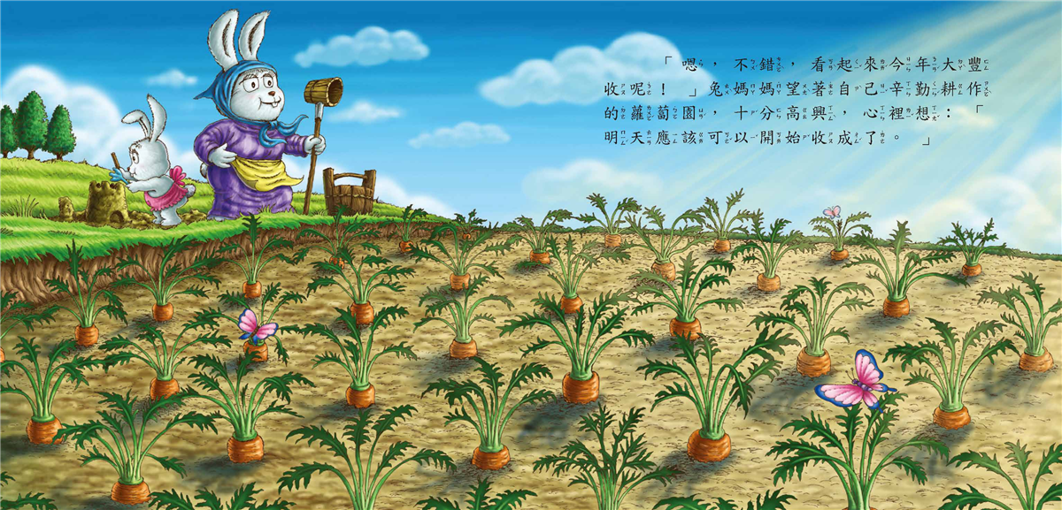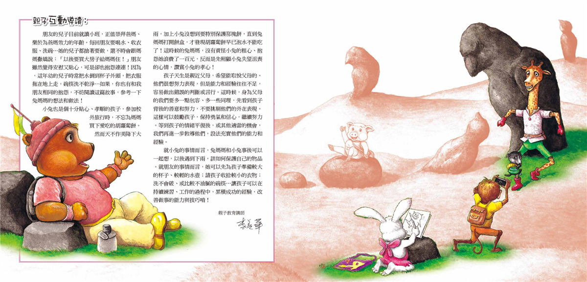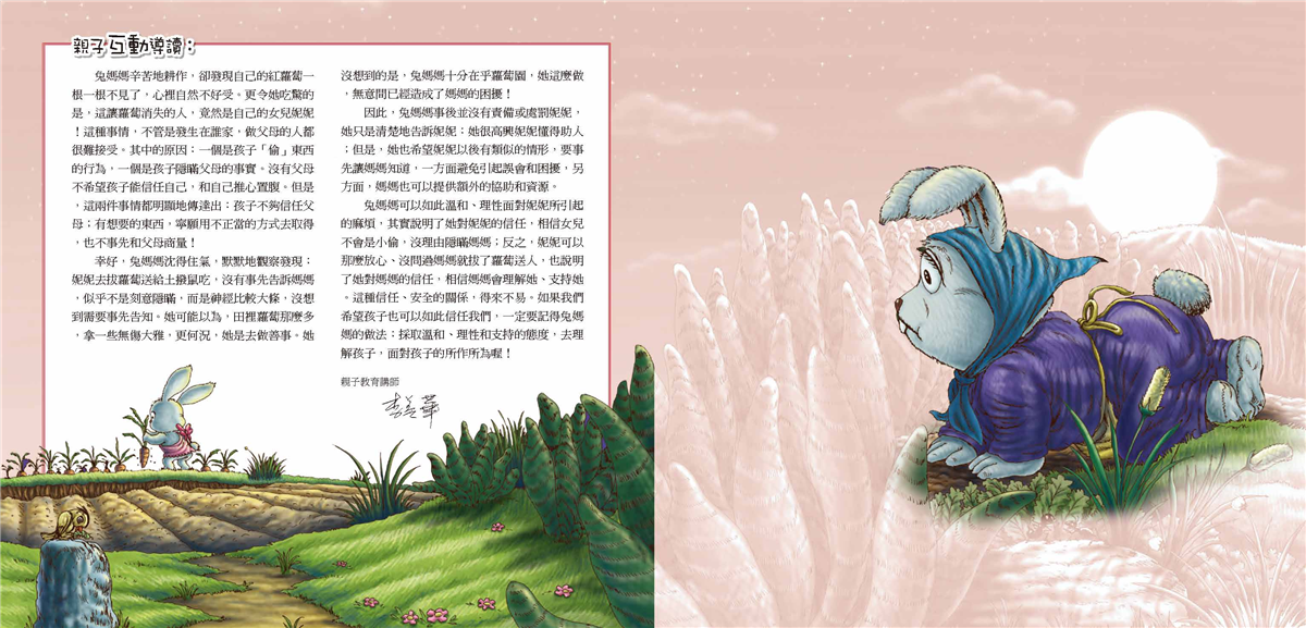 兔媽媽可以如此溫和、理性面對妮妮所引起的麻煩,其實說明了她對妮妮的信任,相信女兒不會是小偷,沒理由隱瞞媽媽;反之,妮妮可以那麼放心、沒問過媽媽就拔了蘿蔔送人,也說明了她對媽媽的信任,相信媽媽會理解她、支持她。這種信任、安全的關係,得來不易。如果我們希望孩子也可以如此信任我們,一定要記得兔媽媽的做法:採取溫和、理性和支持的態度,去理解孩子,面對孩子的所作所為喔!