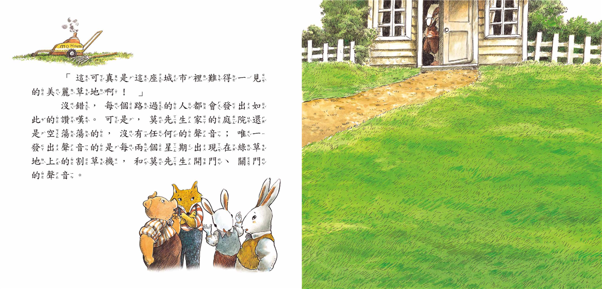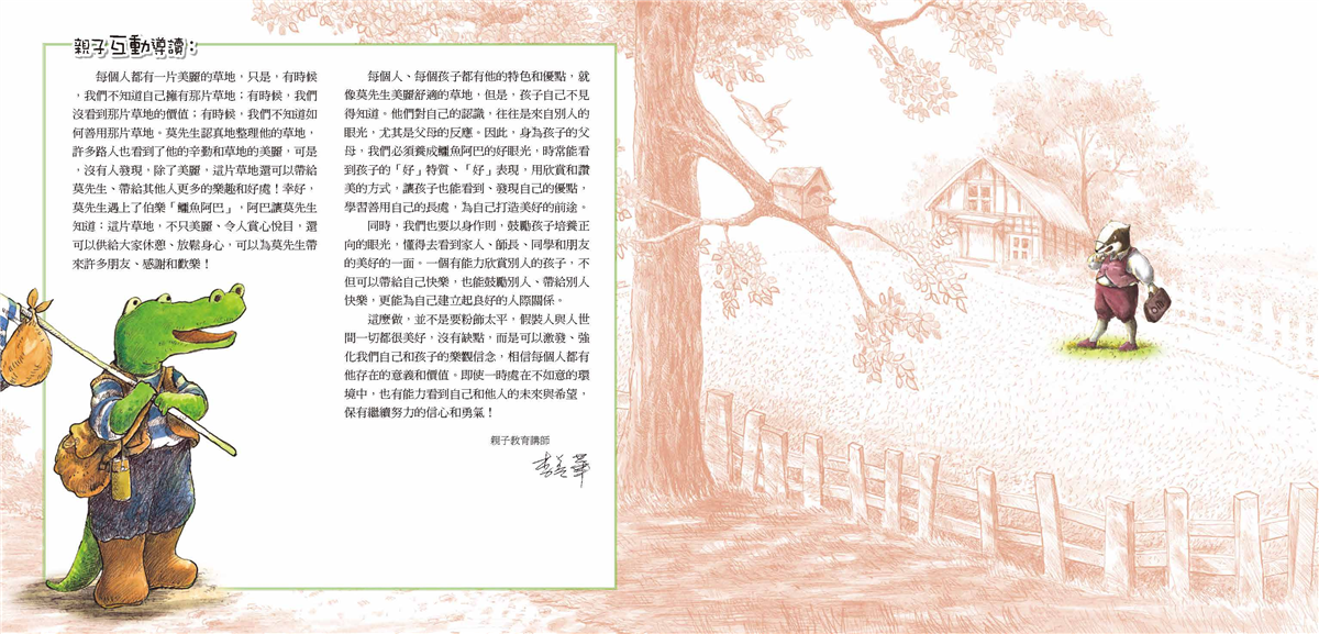 每個人、每個孩子都有他的特色和優點,就像莫先生美麗舒適的草地,但是,孩子自己不見得知道。因此,身為孩子的父母,我們必須養成鱷魚阿巴的好眼光,時常能看到孩子的「好」特質、「好」表現,用欣賞和讚美的方式,讓孩子也能看到、發現自己的優點,學習善用自己的長處,為自己打造美好的前途。