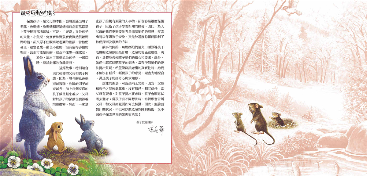 這篇故事,特別適合現代社會的父母和孩子閱讀,因為,現今的社會越來越複雜,危險的因子越來越多,加上每個家庭的孩子數目越來越少,父母對於孩子的保護也變得越來越嚴密。然而,一味禁止孩子接觸有風險的人事物,卻也容易過度保護孩子,阻斷了孩子學習新知的機會。